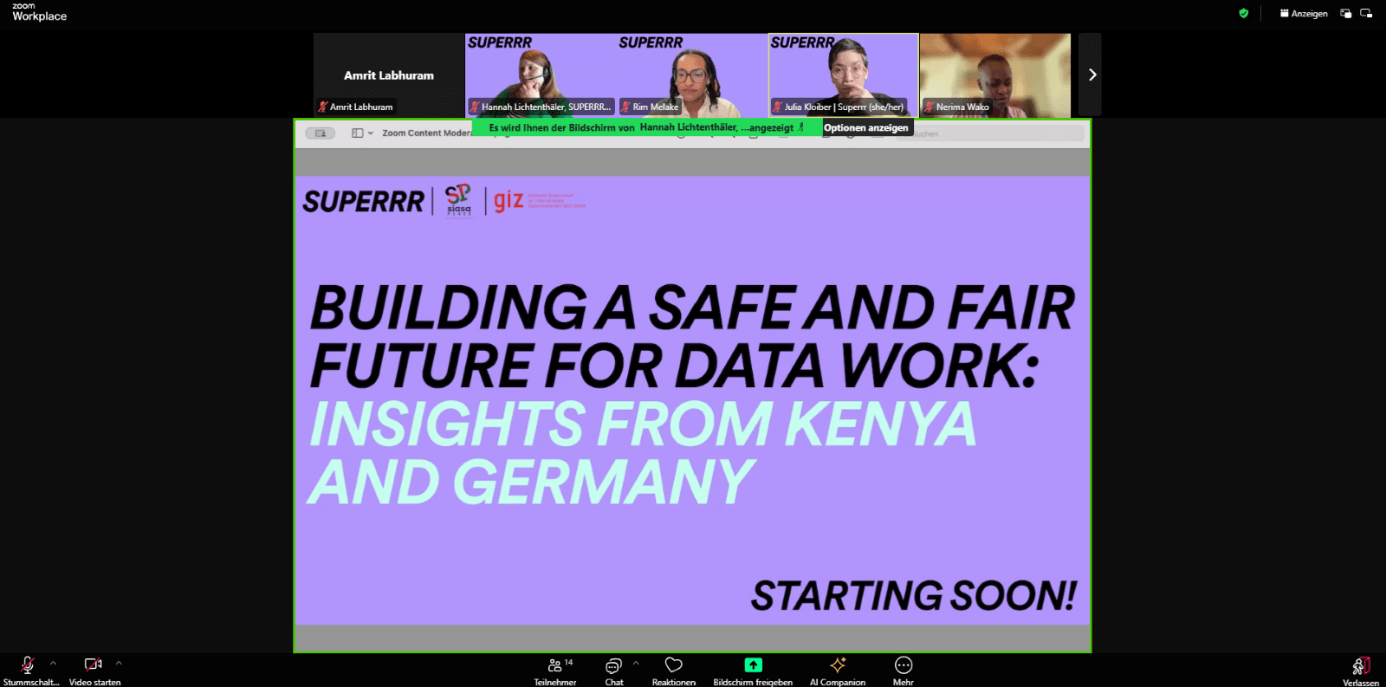 Die beiden NGOs Siasa Place und Superrr Lab luden Beschäftigte aus dem Bereich der Datenarbeit, Arbeitsrechtsaktivistinnen und -aktivisten, Regierungsbeamte und Gesetzgeber, Forscherinnen und -forscher sowie Gewerkschaften und zivilgesellschaftliche Organisationen zu einem virtuellen Roundtable ein. Sie diskutierten gemeinsam über Probleme und Möglichkeiten bei der Umsetzung der Forderungen der Arbeitnehmenden nach besseren Arbeitsbedingungen sowie über Strategien und kulturübergreifende Netzwerke, die gegenseitige Solidarität unterstützen und Veränderungen vorantreiben.