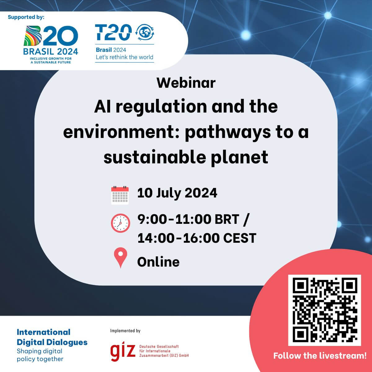The Secretariat for the Brazilian-German Digital Dialogue will host a panel discussion about “AI regulation and the environment: pathways to a sustainable planet” in partnership with the G20 engagement groups for Business (B20) and Think Thanks (T20). The event will take place on 10 July 2024 from 09:00 to 11:00 BRT / 14:00 to 16:00 CEST. The discussion will be held in English.