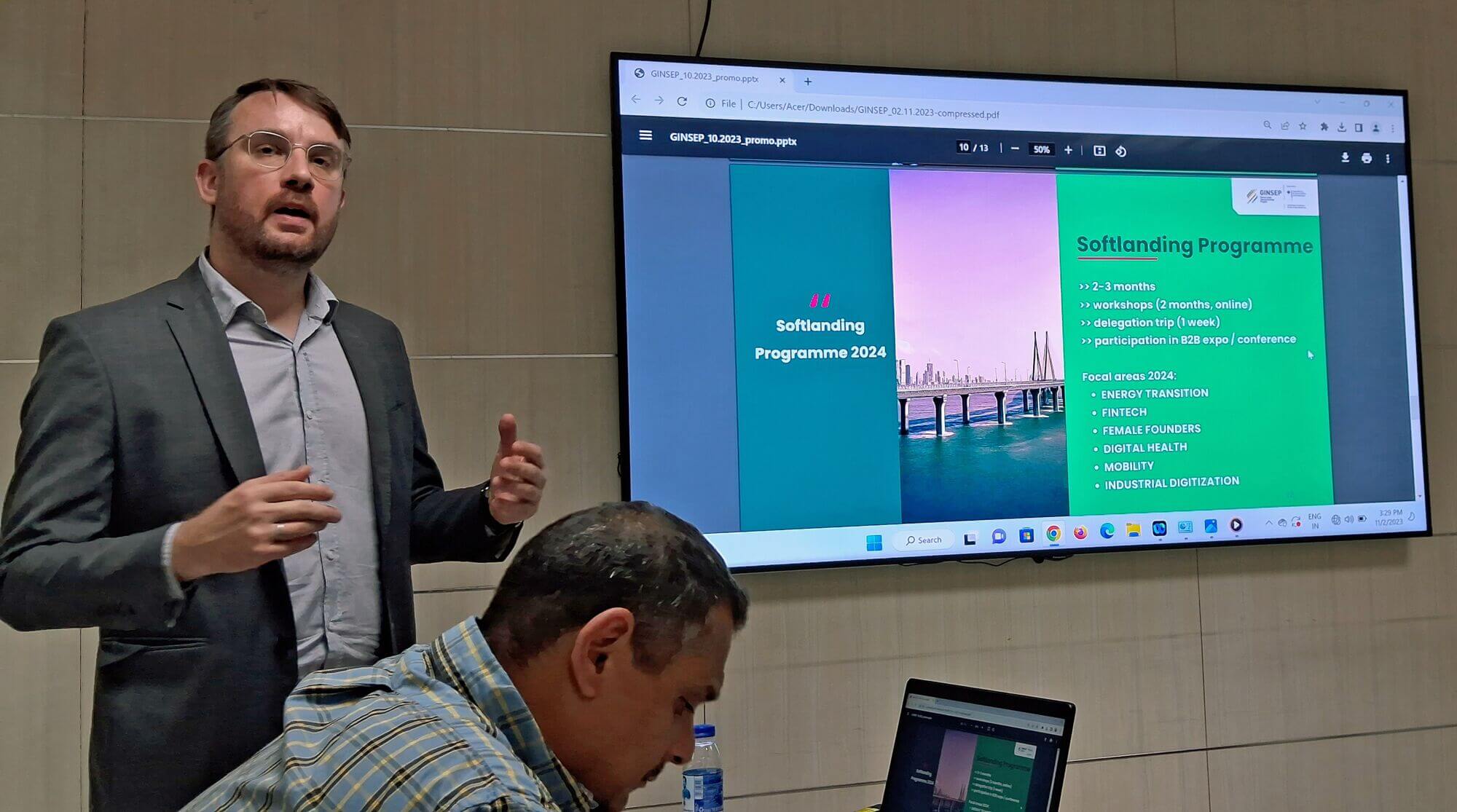 Julian Zix, Project Lead at GINSEP, presented the activities and services offered by GINSEP, including a plan for an upcoming soft-landing project: GINSEP offers a three-month-long workshop for Indian start-ups to build their capacities and enter the German market. The 2024 project would cater to start-ups in the field of energy transition, fintech, digital health, mobility and industrial digitalisation while focusing on female founders.