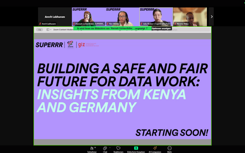 Hosted by Siasa Place & Superrr Lab, this virtual event allowed stakeholders to discuss safe and fair working conditions for data workers. It was based on the main demands and objectives developed by content moderators and data annotators from Germany and Kenya during the Nairobi Content Moderators International Solidarity Meeting in August 2024.